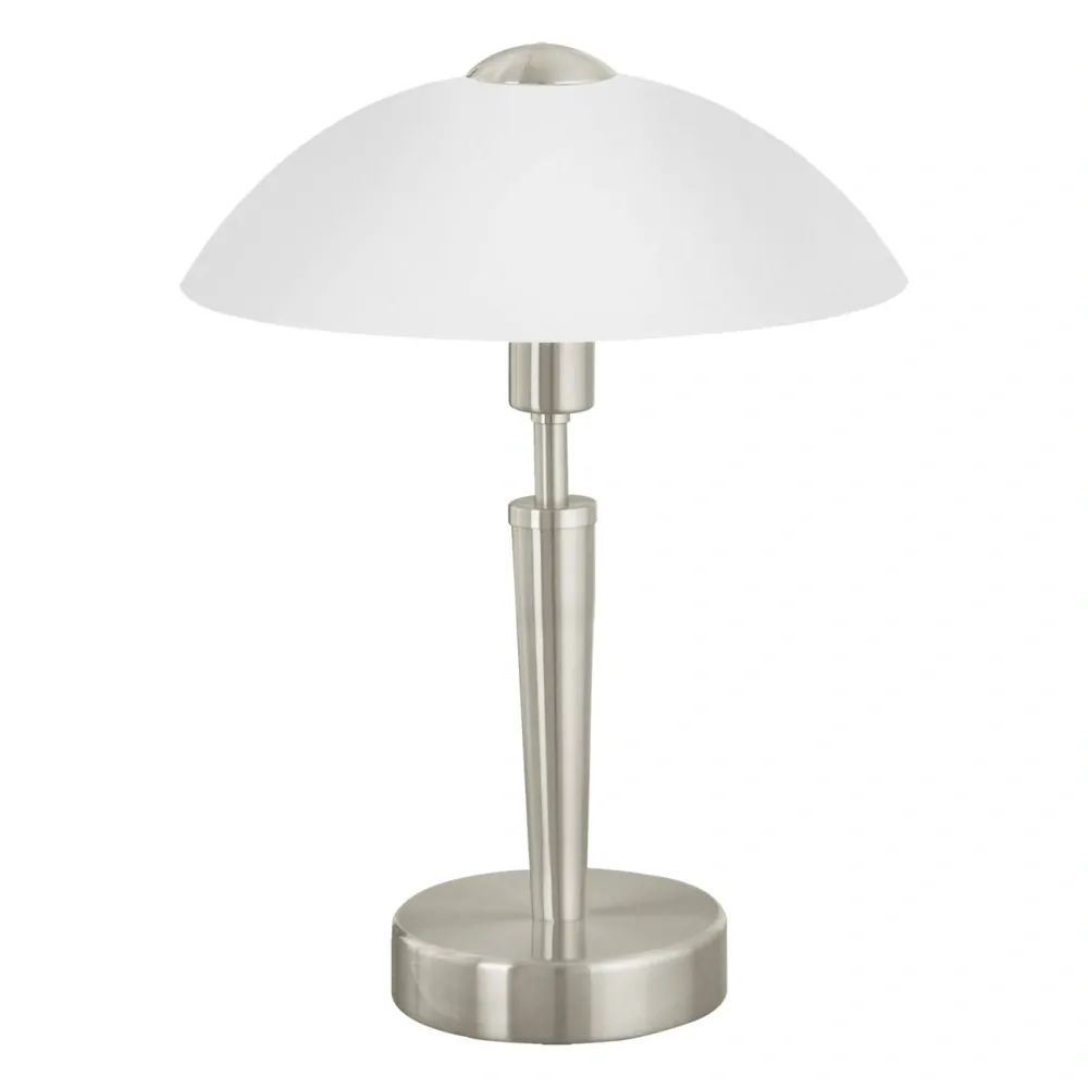 Stolní lampa 1xE27/60W/nikl matný-bílé sklo, dotykové zapínámí se třemi úrovněmi jasu světla.